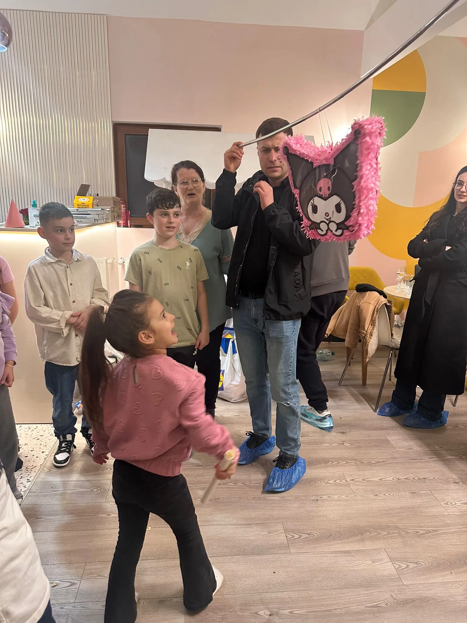 Copiii s-au adunat în jur, curioși și plini de energie, iar rând pe rând au încercat să lovească piniata. Emoția a crescut cu fiecare lovitură, iar când aceasta s-a spart, surpriza din interior a stârnit un val de bucurie și râsete.